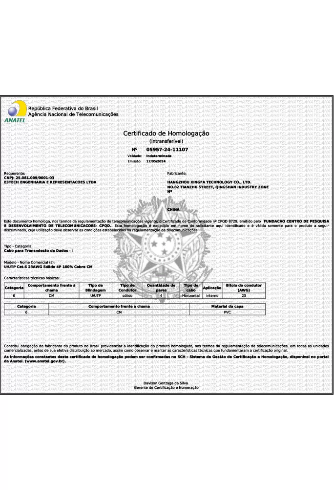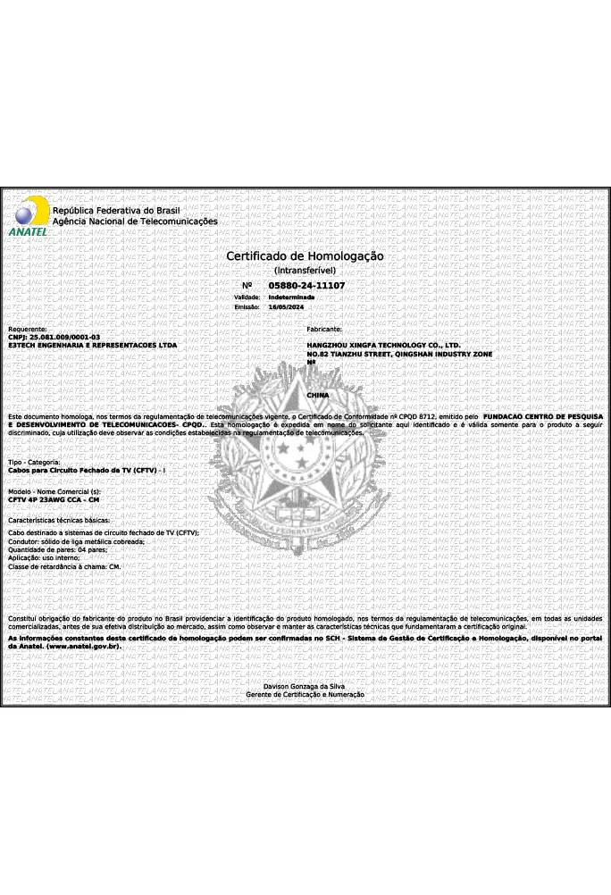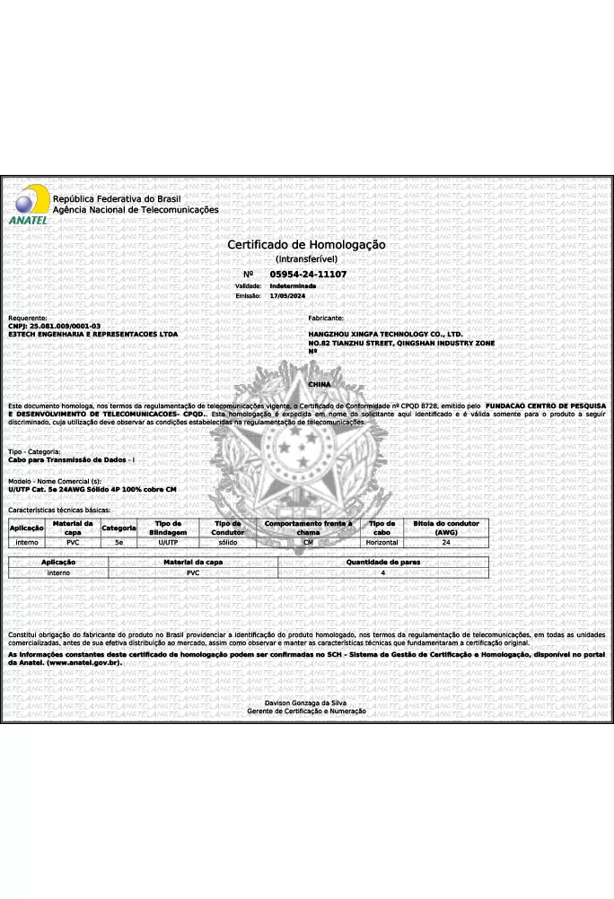 Cada produto vem com documentação completa, incluindo o número oficial do certificado e o selo de homologação, que devem ser afixados no próprio cabo de acordo com a regulamentação brasileira.