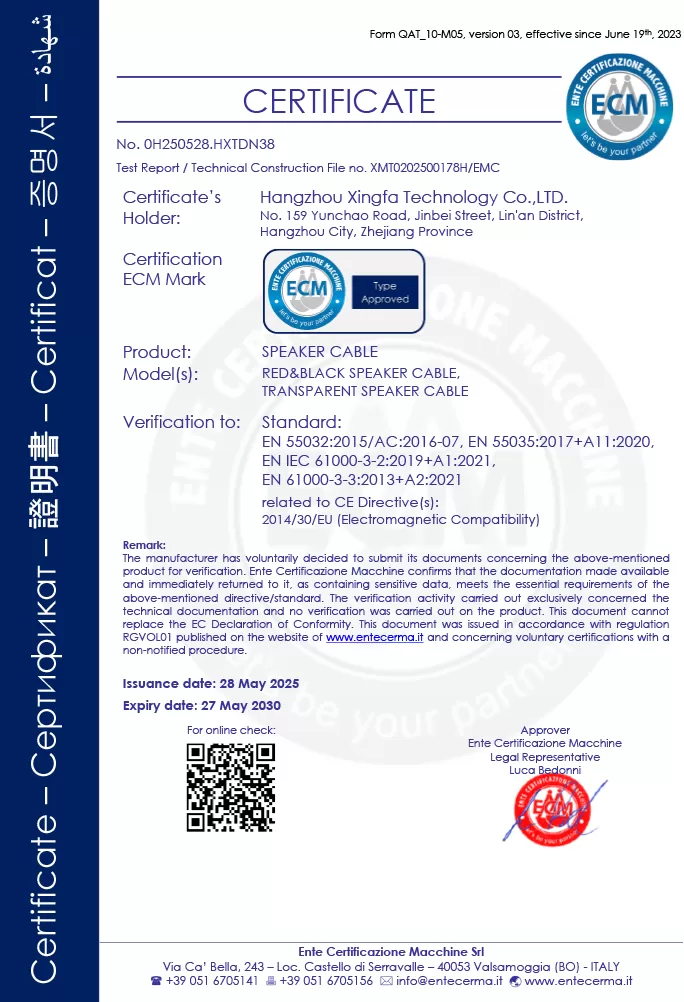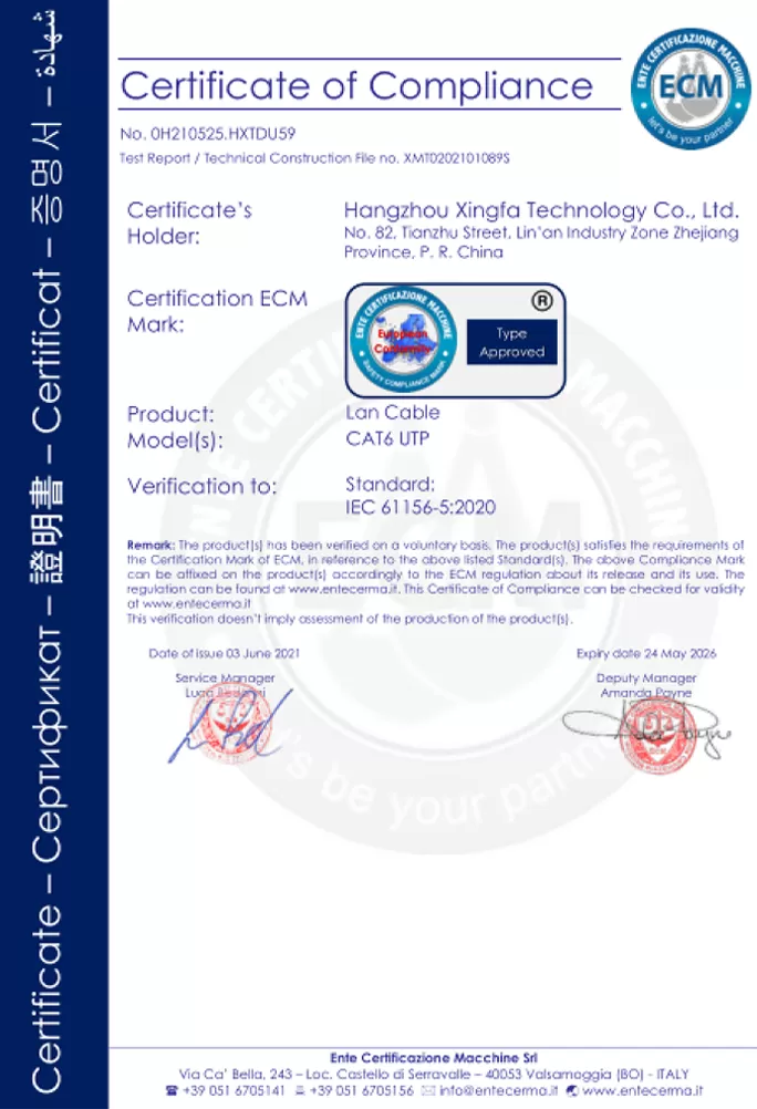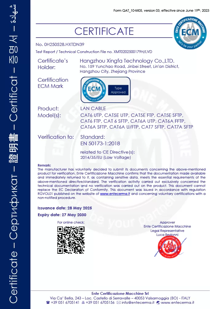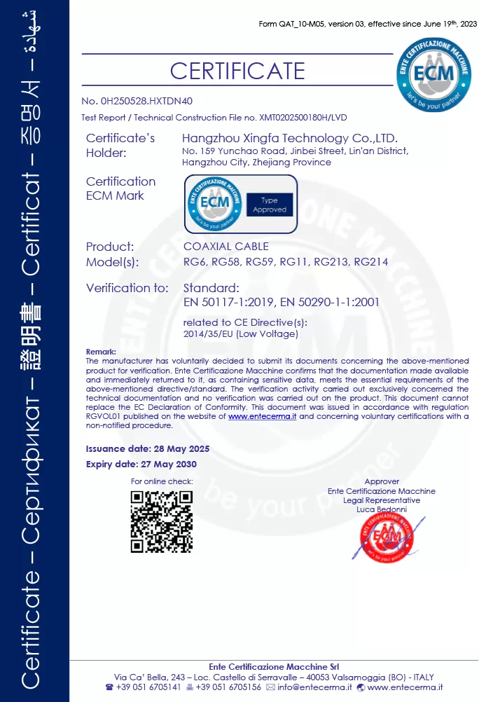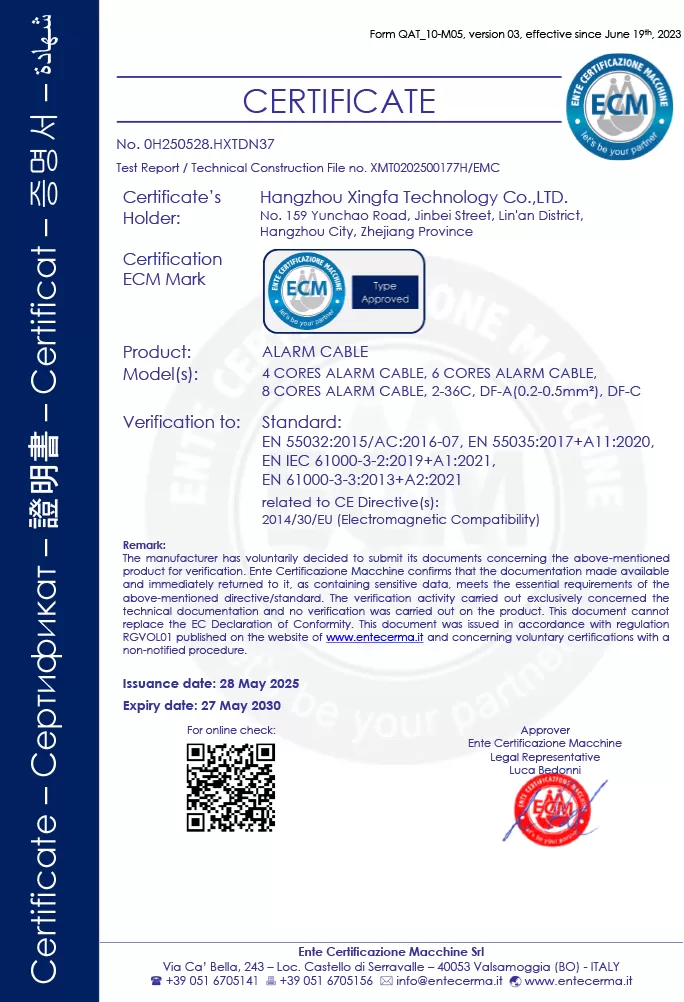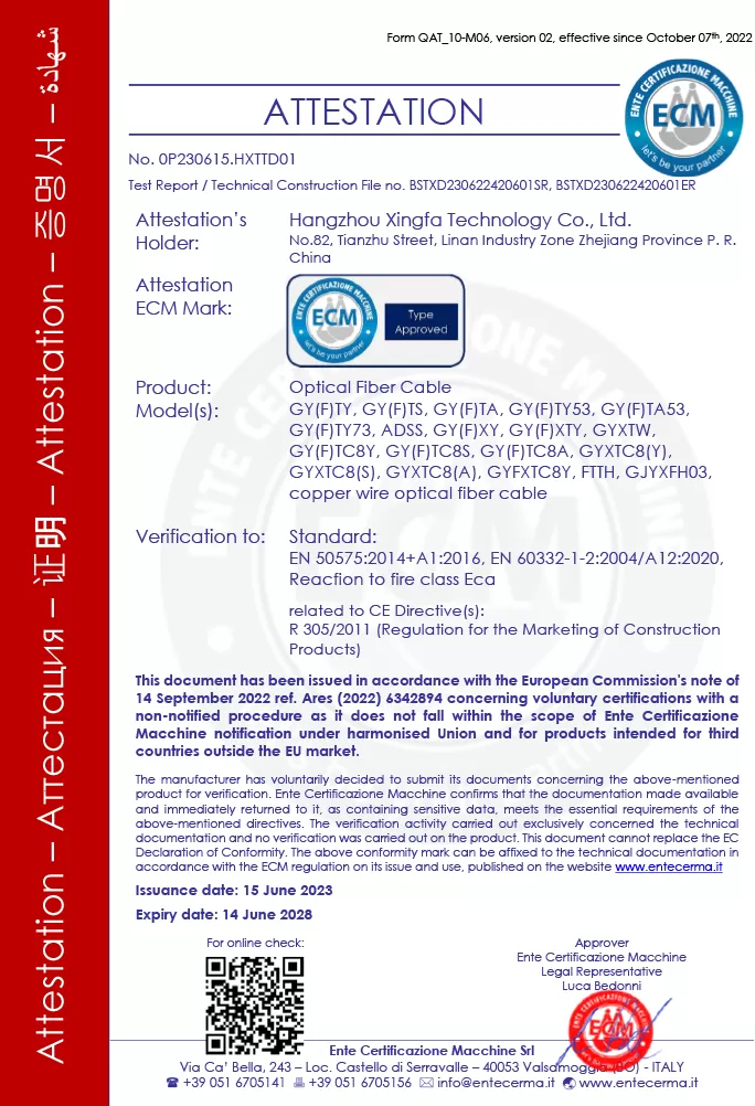 Não, este é um equívoco comum. A marca CE é uma autodeclaração do fabricante, não um selo de qualidade. É nossa declaração legal (Hangzhou Xingfa) que nossos cabos estão em total conformidade com toda a legislação da UE em matéria de saúde, segurança e meio ambiente. Baseamos esta declaração em testes rigorosos em relação às normas europeias harmonizadas.