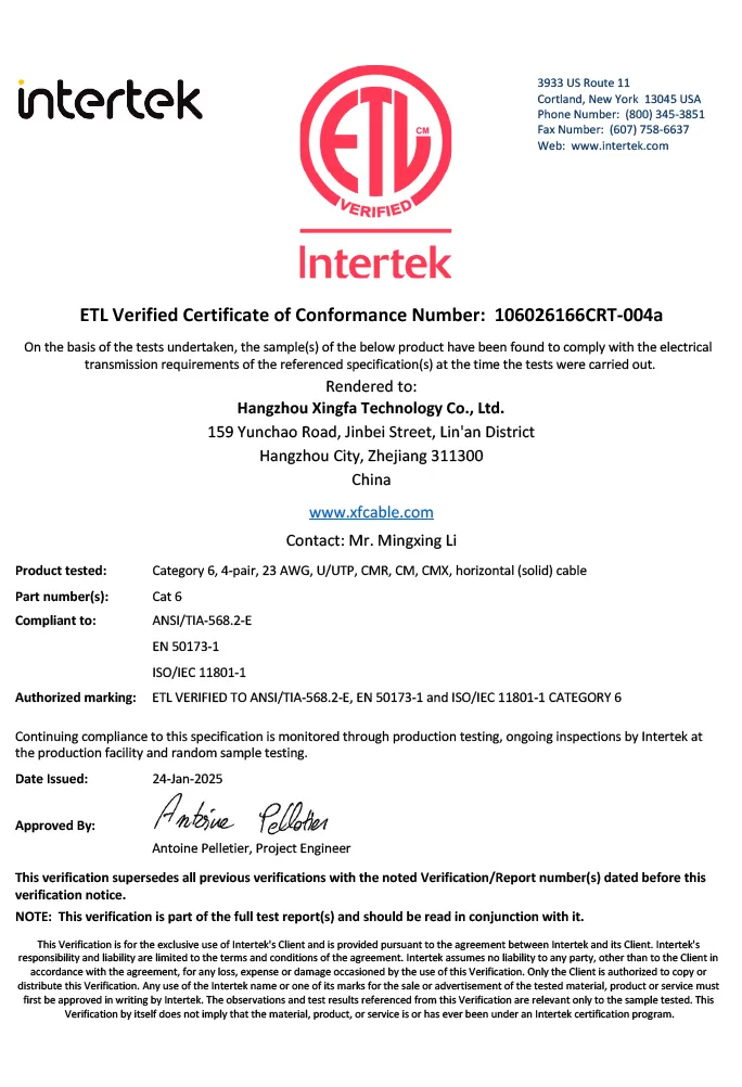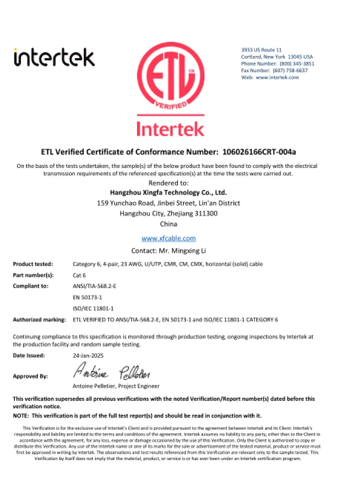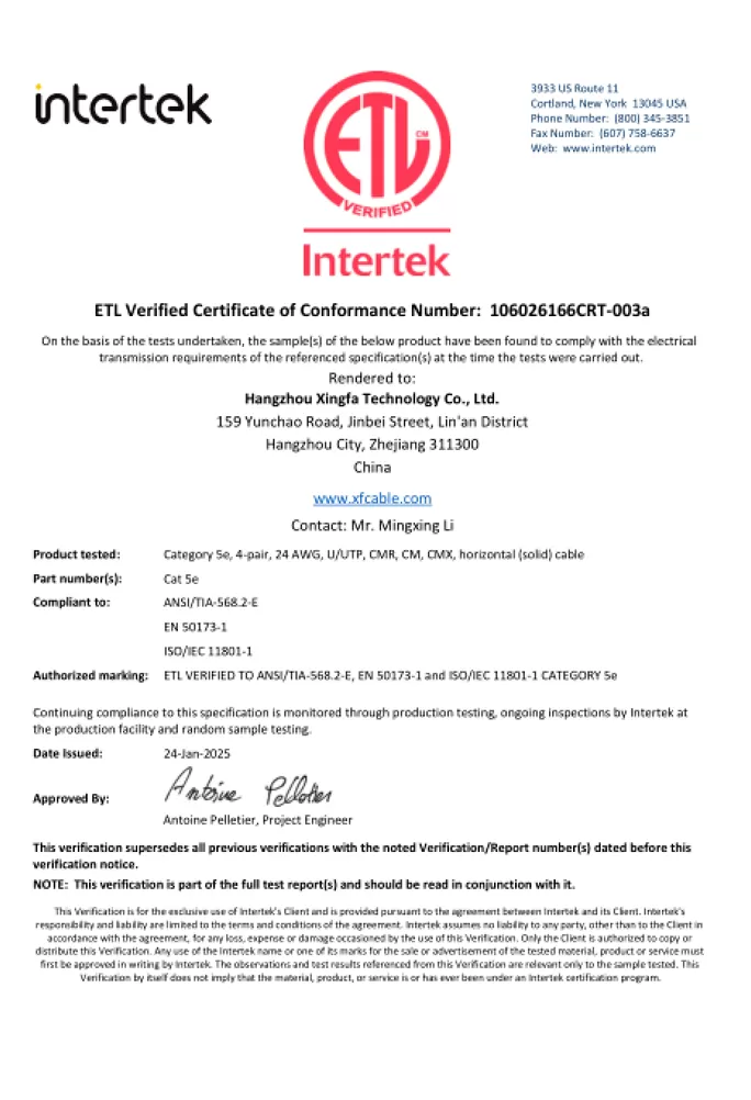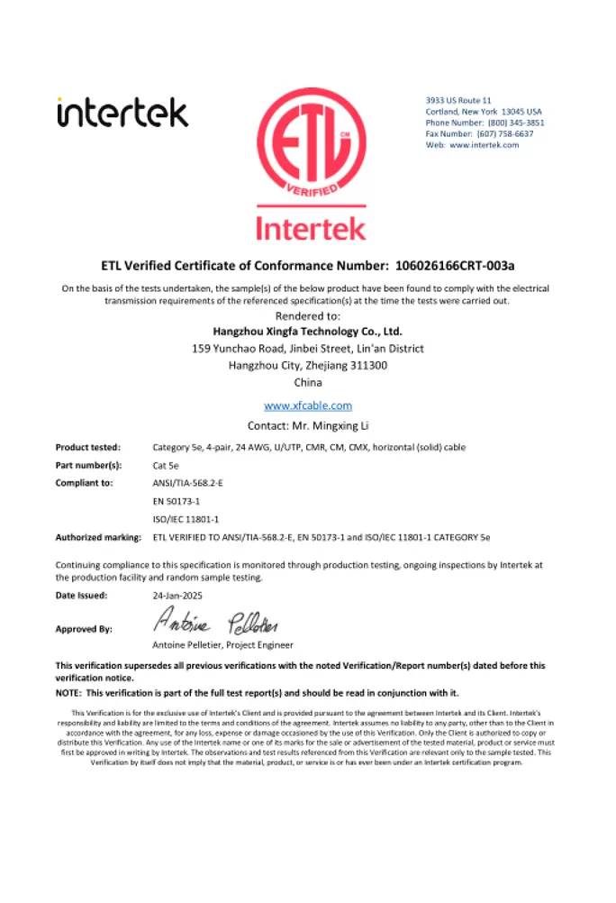 A marca listada ETL, emitida pela Intertek, é uma certificação de segurança reconhecida nacionalmente nos Estados Unidos e Canadá. Para cabos, ele demonstra conformidade rigorosa com os padrões ANSI/UL aplicáveis, garantindo que os produtos sejam seguros para o uso pretendido. Para distribuidores, o fornecimento de cabos certificados ETL significa que você está fornecendo produtos que atendem aos padrões de segurança exigidos por inspetores elétricos, contratados e grandes varejistas, fornecer uma alternativa confiável e muitas vezes econômica para outras marcas de certificação sem comprometer a segurança ou a aceitação do mercado.